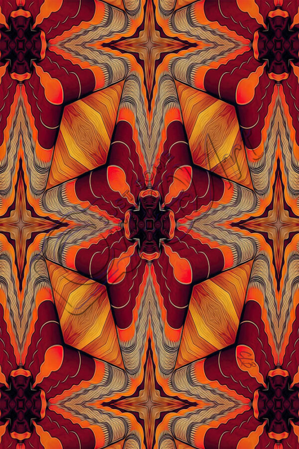 Ein Mandala mit etwas anderen Formen und warmen exotisch anmutenden Farben. Obwohl es auch aus klar abgegrenzten Formen und Farben besteht, wirkt es in der Gesamtbetrachtung nicht so strukturiert wie die meisten Mandalas. Nichtsdestotrotz stahlt es eine angenehme, warme Energie aus den tiefen Zerklüftungen aus.
